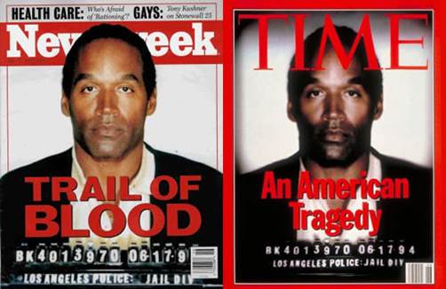 Na obrázku možno vidieť, ako jeden magazín vykresľuje udalosť ako bezcitnú vraždu, s množstvom krvi, čím jasne naznačuje, že Simpson by mal ísť do väzenia. Druhý magazín prezentuje udalosť ako nešťastnú náhodu – americkú tragédiu. Podľa magazínu Time je Simpson súdený neprávom. Titulky sú teda jasne zamerané na emócie publika a snažia sa mu predostrieť svoj pohľad na danú udalosť. Verejnú mienku neovplyvňuje len titulok magazínov, ale aj úprava hlavnej fotografie. Druhý magazín úvodnú fotografiu značne upravil. Pridal tmavý tón, ktorý vyvoláva súcit so Simpsonom.